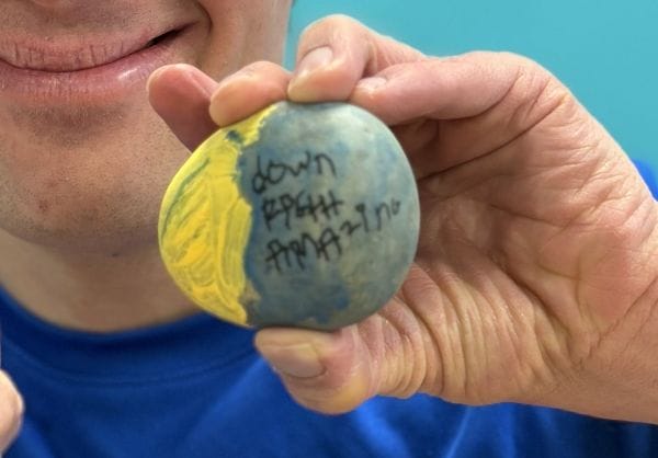When I first walked by to look at Steven’s rock, it was painted half blue and half yellow.  He said that it represented “night and day”. But really, Steven was pulling a fast one on me.  He chose blue and yellow because they are the official colors for Down syndrome awareness.
